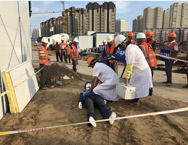 此次應(yīng)急救援預(yù)案演練模擬施工工人從高處墜落。“意外”發(fā)生后,現(xiàn)場(chǎng)負(fù)責(zé)人立即組織人員撤出危險(xiǎn)區(qū),并在匯報(bào)情況后聽從指示在第一時(shí)間啟動(dòng)應(yīng)急預(yù)案。在應(yīng)急總指揮的指令下,救援小組迅速就位,并有序展開警戒護(hù)衛(wèi)、技術(shù)排險(xiǎn)、現(xiàn)場(chǎng)搶險(xiǎn)、醫(yī)療救護(hù)等各項(xiàng)救援工作,使險(xiǎn)情得到有效控制,隨后,傷員被送往醫(yī)院進(jìn)行救治。