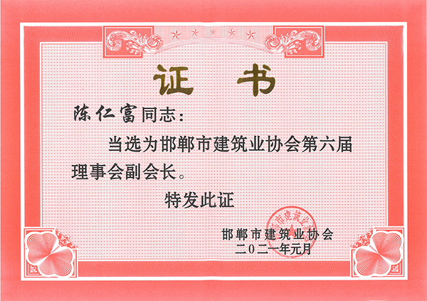 2021年1月8日,邯鄲市建筑業(yè)協(xié)會(huì)第六屆會(huì)員大會(huì)第二次會(huì)議在邯鄲市舉行。會(huì)上,第三工程公司總經(jīng)理陳仁富當(dāng)選為邯鄲市建筑業(yè)協(xié)會(huì)第六屆理事會(huì)副會(huì)長(zhǎng)。
