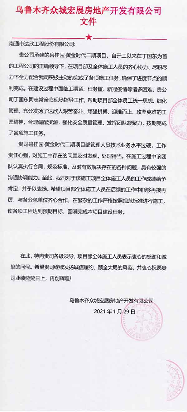 1月29日,集團(tuán)總部收到烏魯木齊眾城宏展房地產(chǎn)開發(fā)有限公司對第十一工程公司的表揚(yáng)信。詳情如下: