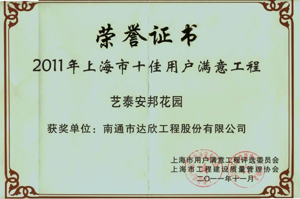 上海市“十佳用戶滿意工程”是上海市建筑業(yè)重量級(jí)獎(jiǎng)項(xiàng),是上海市在建的大型工程中,通過(guò)業(yè)主等部門使用后,選出十五項(xiàng)質(zhì)量?jī)?yōu)秀、后期運(yùn)行穩(wěn)定、服務(wù)質(zhì)量?jī)?yōu)秀的工程為候選單位,并在十五項(xiàng)候選工程中選出十項(xiàng)通過(guò)專家評(píng)審,方可獲得上海市“十佳用戶滿意工程”獎(jiǎng)。獲此獎(jiǎng)項(xiàng)標(biāo)志著達(dá)欣公司進(jìn)滬施工的信譽(yù)和業(yè)績(jī)提高到了一個(gè)更高層次,必將對(duì)持續(xù)經(jīng)營(yíng)開發(fā)起到良好的社會(huì)影響。