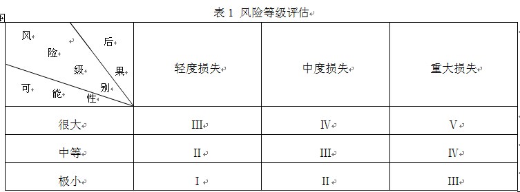 在對危險(xiǎn)源識(shí)別的基礎(chǔ)上,評估危險(xiǎn)源造成風(fēng)險(xiǎn)可能性和大小,對風(fēng)險(xiǎn)進(jìn)行分級,對不同等級風(fēng)險(xiǎn)采用相應(yīng)的風(fēng)險(xiǎn)控制措施。風(fēng)險(xiǎn)等級評估:Ⅰ級為可忽略風(fēng)險(xiǎn);Ⅱ級為可接受風(fēng)險(xiǎn);Ⅲ級為中度風(fēng)險(xiǎn);Ⅳ級為重大風(fēng)險(xiǎn);Ⅴ級為不容許風(fēng)險(xiǎn),如表1。