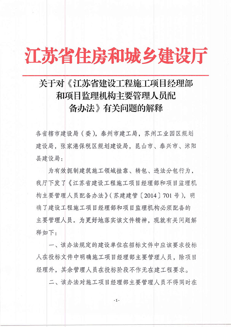 附件:關(guān)于對《江蘇省建設(shè)工程施工項目經(jīng)理部和項目監(jiān)理機構(gòu)主要管理人員配備辦法》有關(guān)問題的解釋